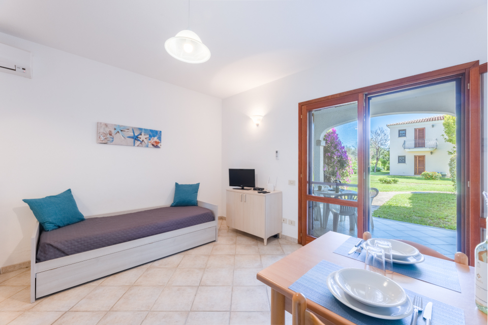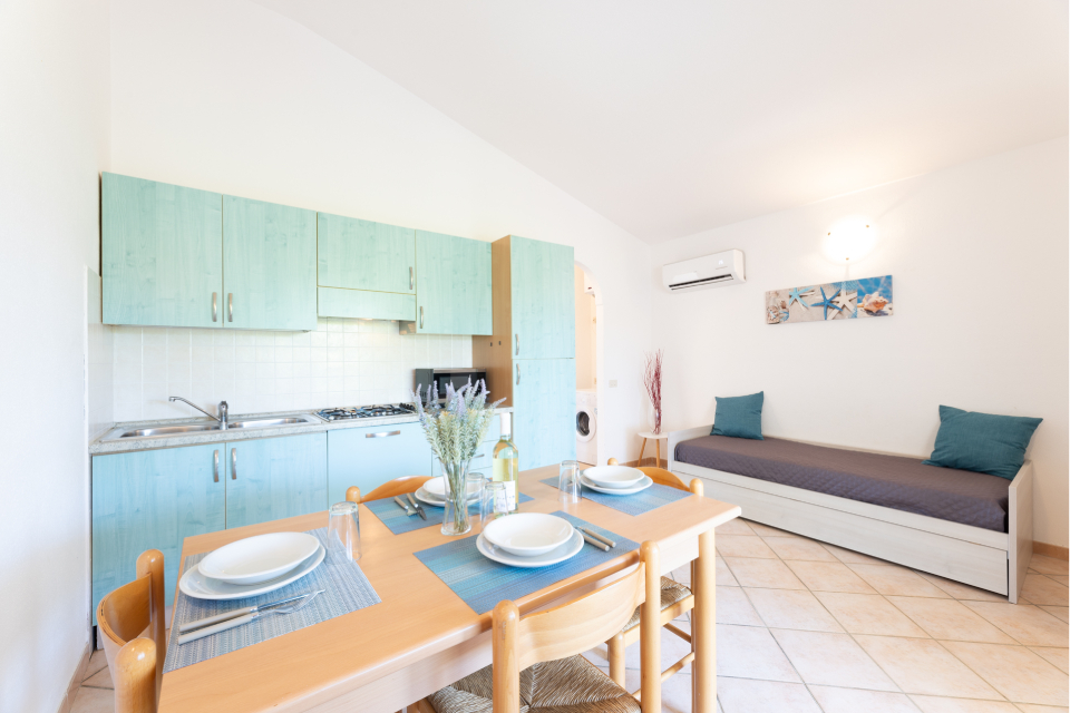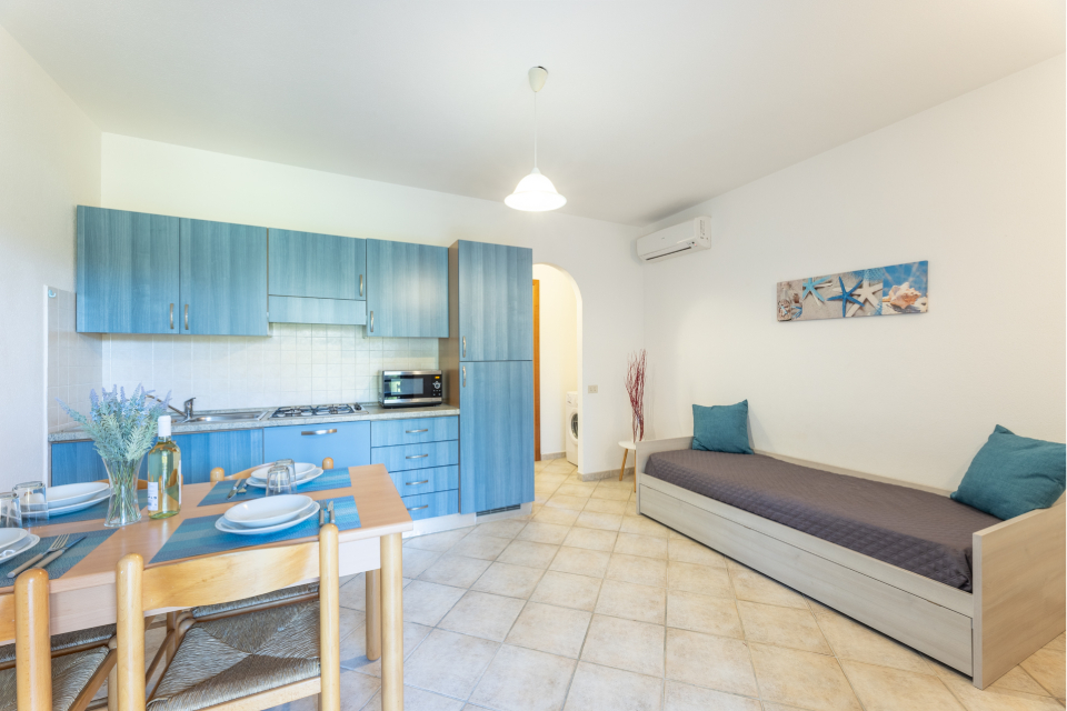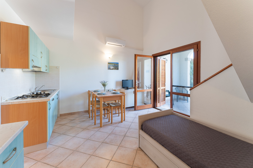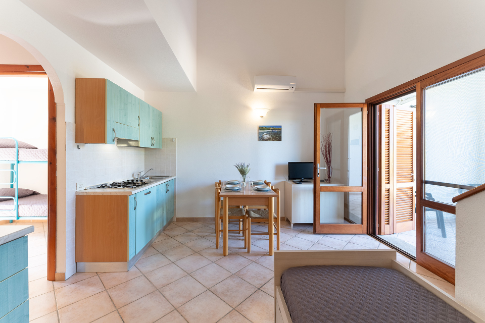 BILO 2 posti letto (mq 33 ca) Soggiorno con angolo cottura. Camera matrimoniale. Servizi. BILO 4 posti letto (mq 33 ca) Soggiorno con angolo cottura e divano letto doppio. Camera matrimoniale. Servizi. TRILO DS 6 posti letto (mq 43/50 ca) Disposto su due livelli. Piano terra: Soggiorno con angolo cottura e divano letto doppio. Camerina con letto a castello. Primo piano con camera matrimoniale. Doppi servizi (uno per piano).